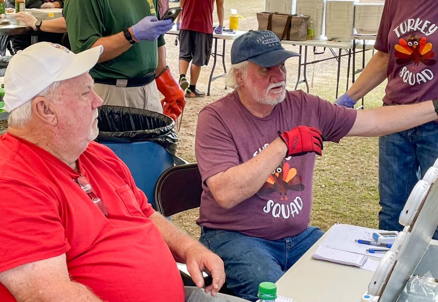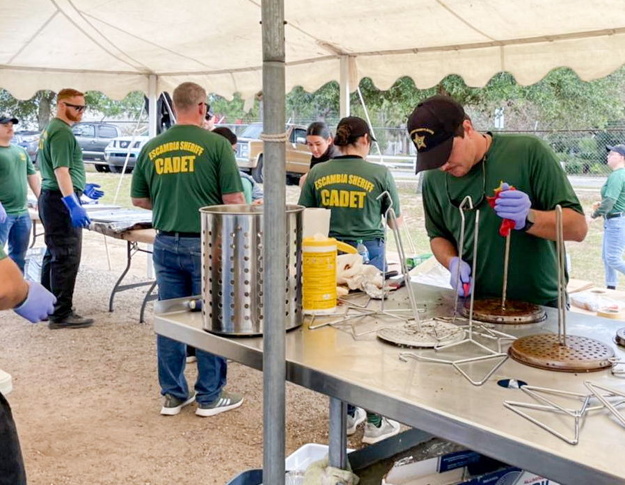 A small army of volunteers worked to deep fry the turkeys to perfection, rows of timers keeping track of the cooking time at a command center of sorts. Cadets from the Escambia County Sheriff’s Office also volunteered to make sure the turkeys were ready to enjoy for Thanksgiving.
