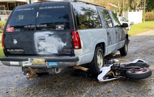 Where was the SUV driver’s “Watch For Motorcycles” bumper sticker? That seems a better choice than the ones attached to the vehicle.