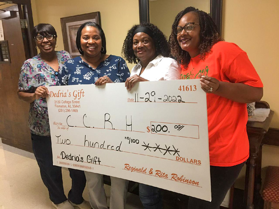 With help from St. Luke Missionary Baptist Church in Century, Deidra’s Gift was able to present a donation to the Century Center for Rehabilitation & Healing.