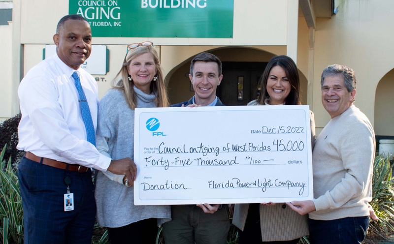 Florida Power & Light Company recently donated $45,000 to the Council on Aging of West Florida to support seniors in Escambia and Santa Rosa counties. The donation will help fund programs for the roughly 2,200 vulnerable elders served by the agency.
