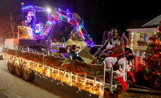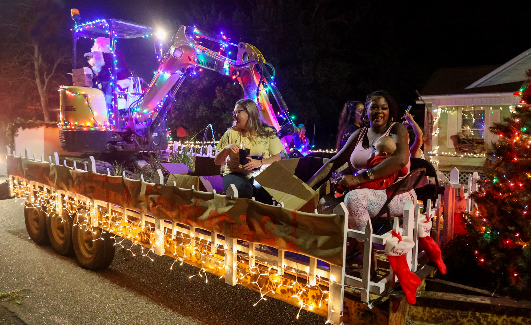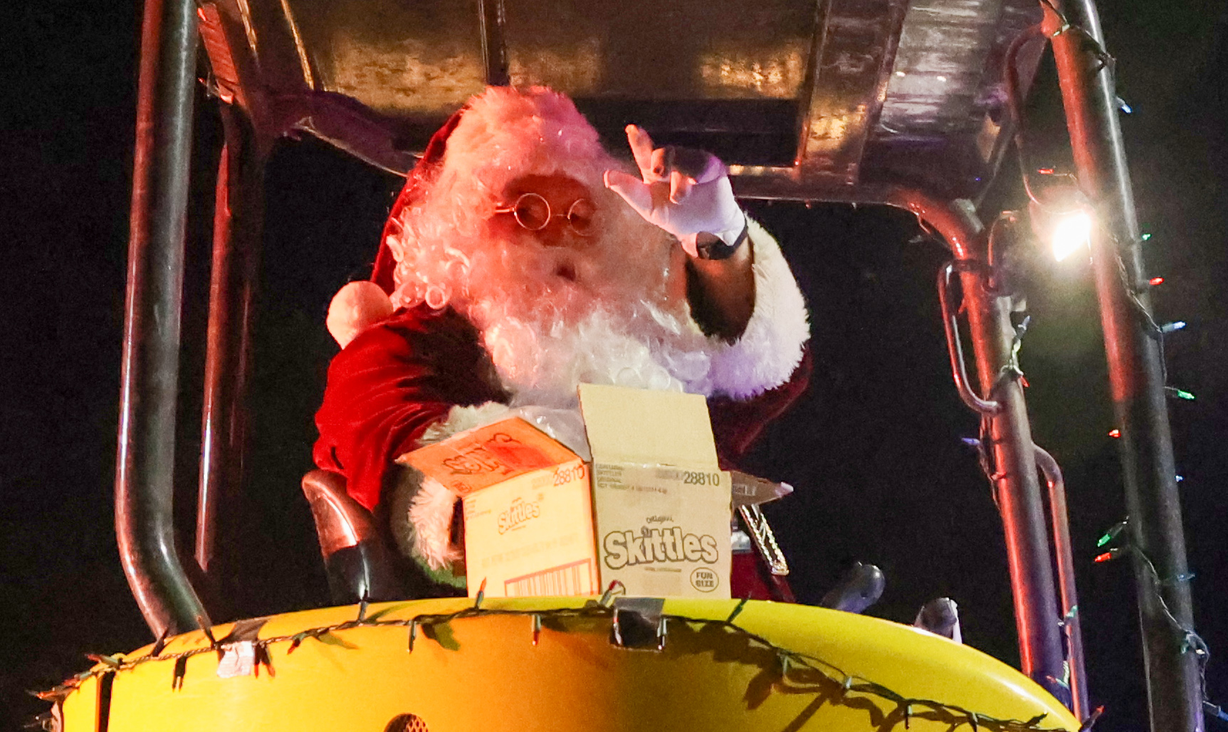 Santa Claus parked his traditional sleigh an rode atop a backhoe on the town’s float, hard at work digging up Christmas.