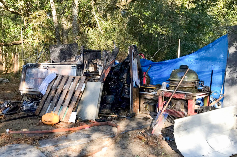 The fire was reported about 8:20 a.m. in the 1900 block of Smyers Road, north of Cottage Hill Road. Firefighters arrived to find what Escambia County Fire Rescue said was a “repurposed camper shell” burning. It was a total loss.