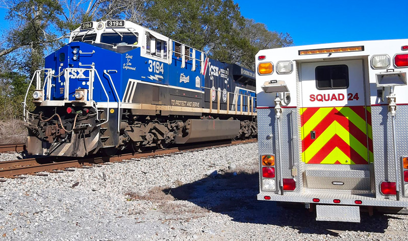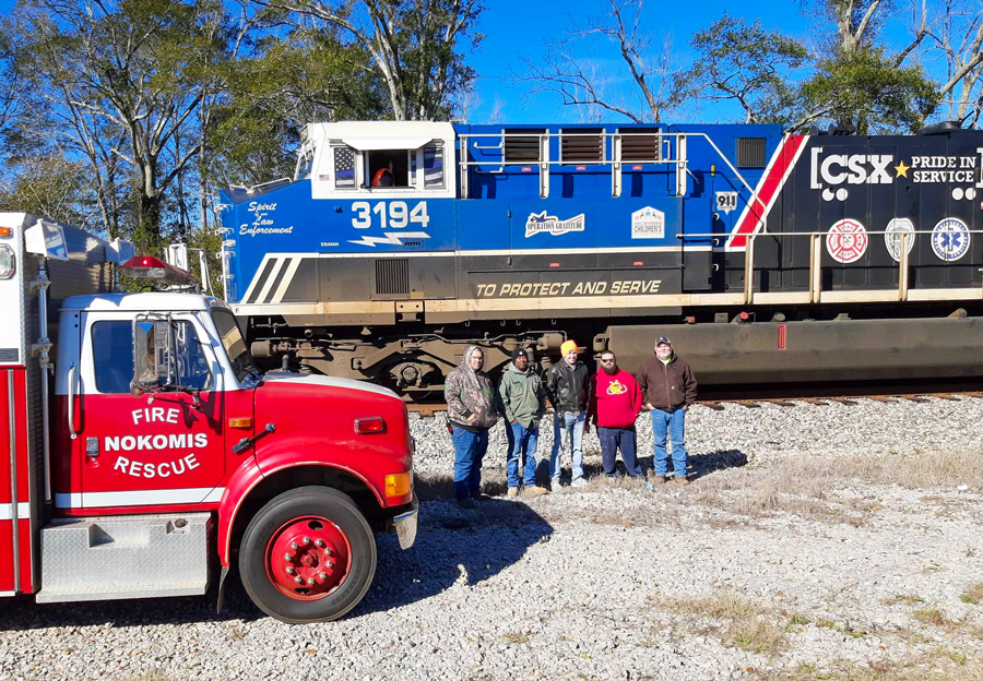 “We had just finished responding to a medical emergency when we spotted this CSX tribute engine with a coal train,” Nokomis Fire Rescue Captain Jerry Gehman said. He and fellow firefighters Chief Tommy Pickern, Lt. Frisco Gehman, medic Danny Lowery, firefighters Brad Adams, Robert Grissett, Hannah Miliken, and Hunter Miliken stopped to pose for photos with the Spirit of Law Enforcement.