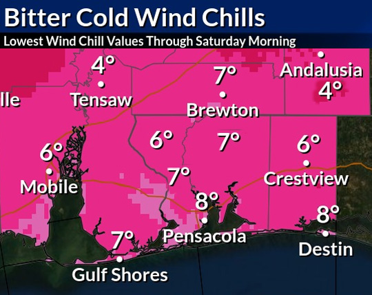 A wind chill advisory is in place through Saturday morning with dangerously low wind chill (“feels like”) temperatures possible. Wind chill values are likely to plunge into the single digits. Hypothermia is possible if precautions are not taken. Avoid outdoor activities if possible. Dress in several layers, cover as much skin as possible, and limit time outdoors. Layers of loose-fitting, lightweight clothing will keep you warmer than one bulky item.
