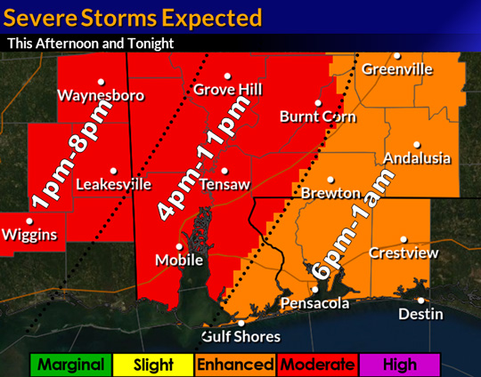 A portion of the North Escambia area has been upgraded to a rare 4 out of 5 (moderate) risk for severe weather into tonight.