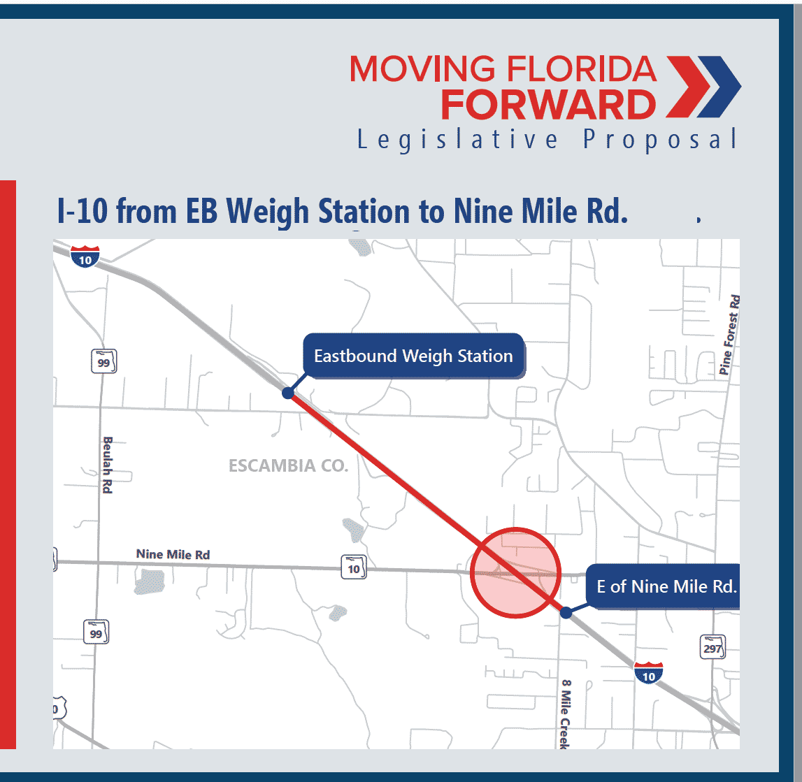 The initiative includes $162 million to widen I-10 to six lanes from the eastbound weigh station to Nine Mile. Road. It would also reconstruct the interchange at Nine Mile Road as a diverging diamond.