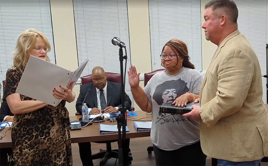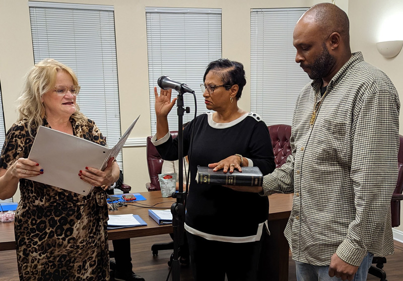 Pictured top: Shelisa Abraham (center) was sworn in Monday night as an interim member of the Century Town Council. Pictured below: Sandra McMurray Jackson (center), who was reelected with no opposition, was sworn in for a four-year term. NorthEscambia.com photos, click to enlarge.