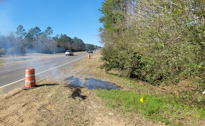 Pictured: A brush fire on Highway 29 near Cedartree Lane Saturday afternoon. NorthEscambia.com photos by Kristi Barbour, click to enlarge.
