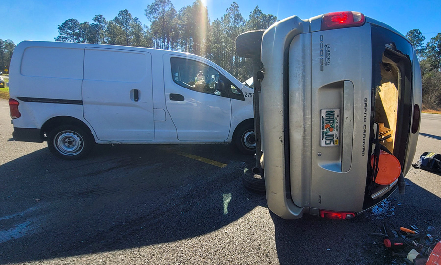 The crash involved a commercial Nissan NV200 cargo van and a Dodge Grand Caravan minivan that overturned. The Caravan came to rest on its side in a median crossover.