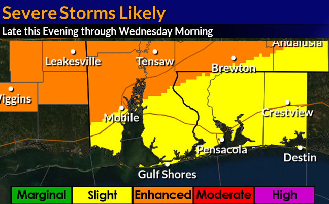There is a slight (2 of 5) risk of severe storms for most of North Escambia tonight into Wednesday morning. There is an enhanced risk (3 of 5) in Escambia County in Alabama along with a small portion of northern Escambia County in Florida.