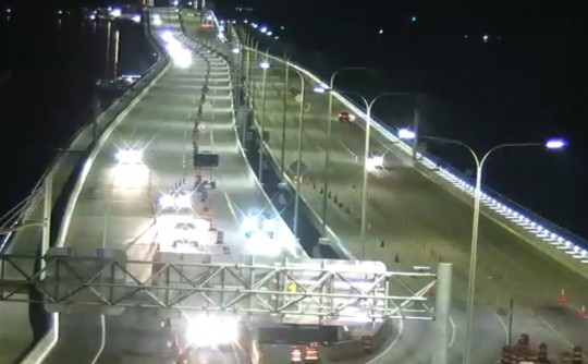 Pictured: Traffic flows over both spans of the Pensacola Bay Bridge about 11:30 Monday night. Image for NorthEscambia.com, click to enlarge.