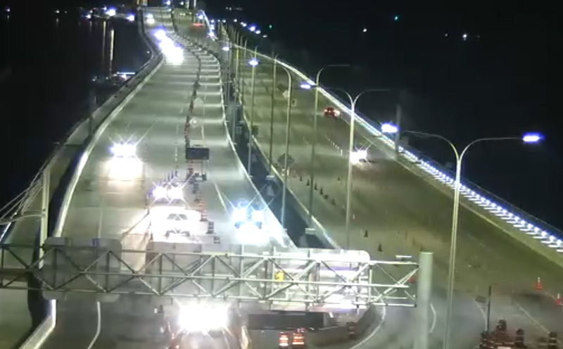 The two spans of the bridge are now temporarily accommodating two east and two westbound travel lanes, but upon final completion of the project each structure will support three lanes of traffic in each direction, along with inside and outside shoulders, and 10-foot-wide multiuse paths for pedestrians and bicyclists.