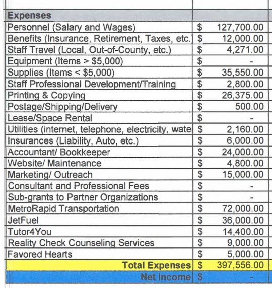 Notes on the UDC budget above, per the application: JetFuel is a Century based technology entrepreneurial business operated by Calvin Cottrell. Tutor4You is a tutoring service with “Mr. Sanders”. Reality Check Counseling is Susan Dawson, a licensed mental health counselor. Favored Hearts is owned by Cordella Allen, a clinical nurse, that will provide CPR certifications.