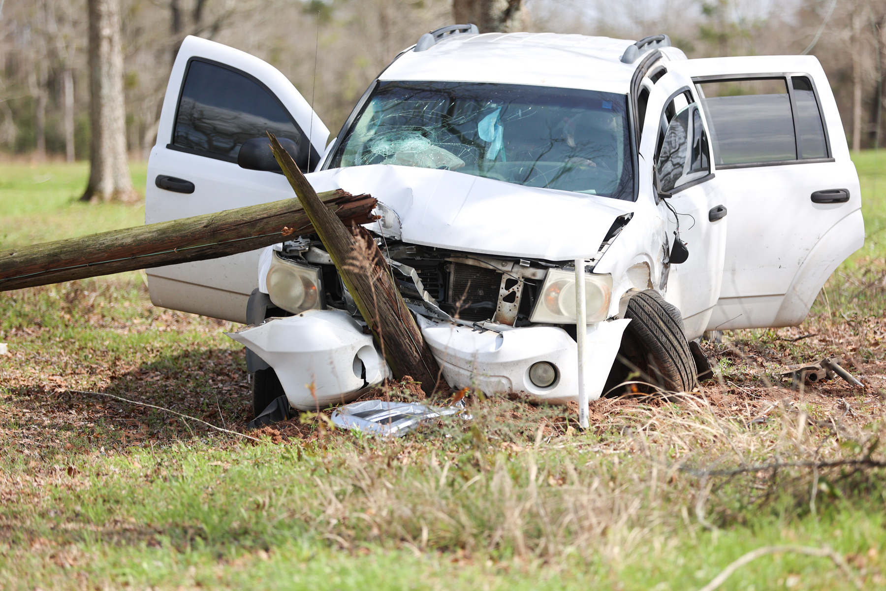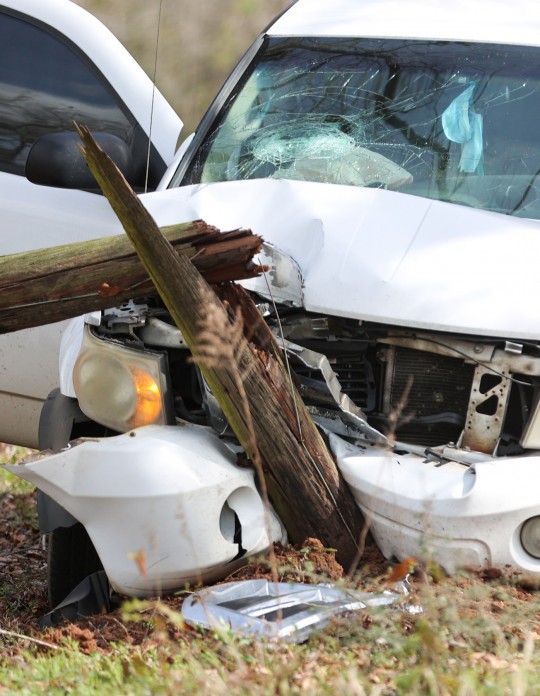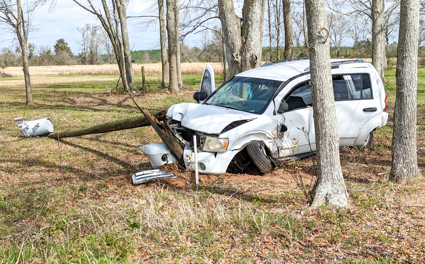 The driver of a SUV was northbound on Highway 97 just south of Ernest Ward Middle School when she failed to properly negotiate a curve. The vehicle left the roadway, traveled between several trees and struck a utility pole. The pole was broken in the crash, sending power lines to the ground.