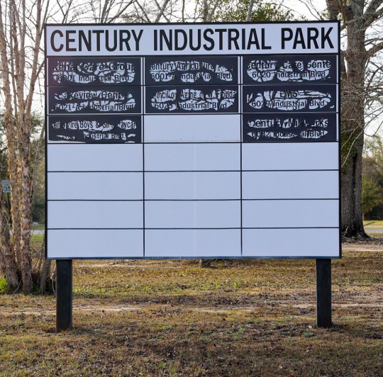 Pictured: The Century Industrial Park sign on West Highway 4. Pictured inset: Century is set to lease this town-owned building in the industrial park. NorthEscambia.com photos, click to enlarge.