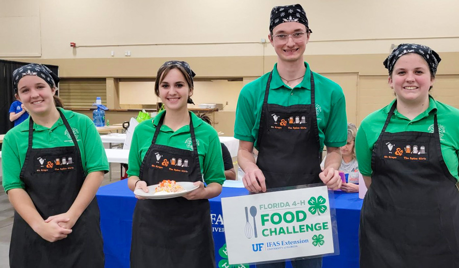 The Florida 4-H Food Challenge provides an opportunity for 4-H’ers to work in teams of three or four youth to create a dish using a predetermined set of ingredients and cooking utensil/equipment. Each team has 40 minutes to plan and prepare a randomly assigned dish (appetizer, side dish, main dish, or dessert) using a “mystery” ingredient while being judged on their food safety skills, teamwork, and ability to manage time and resources. Then youth present their finished dish, deliver a five-minute presentation, and answer questions about their dish from a panel of judges.