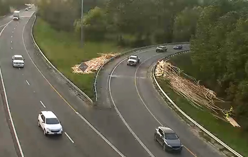 Pictured top: An overturned truck that was hauling lumber shortly after an 11:40 a.m. crash on an I-10 entrance ramp. Pictured below: The lumber remained shortly after 5 p.m., but the truck and trailer had been removed.