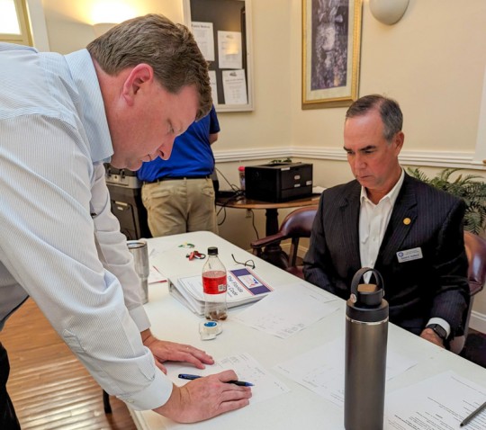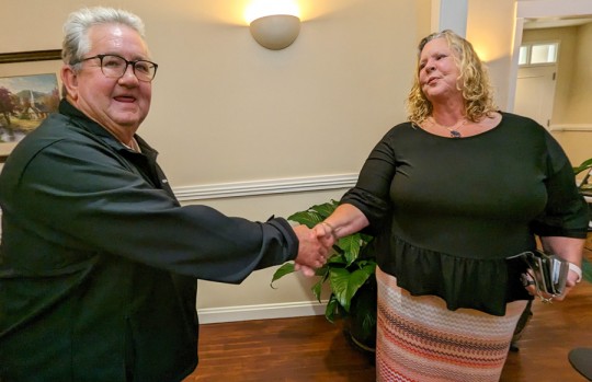 Pictured top: Newly elected Century Town Council members Shelisa McCall (left) and Alicia Johnson (right). Pictured first below: Challenger Eddie Hammond congratulates Johnson Tuesday evening. Second below: Unsuccessful candidate Evelyn Webber said she still looks forward to serving the Century community. Pictured third below: Escambia County Canvassing Board members sign off on election results. Escambia County Commission Chairman Robert Bender (left) and Supervisor of Elections David Stafford (seated) served on the canvassing board along with County Judge Barry E. Dickson, Jr. NorthEscambia.com photos, click to enlarge.