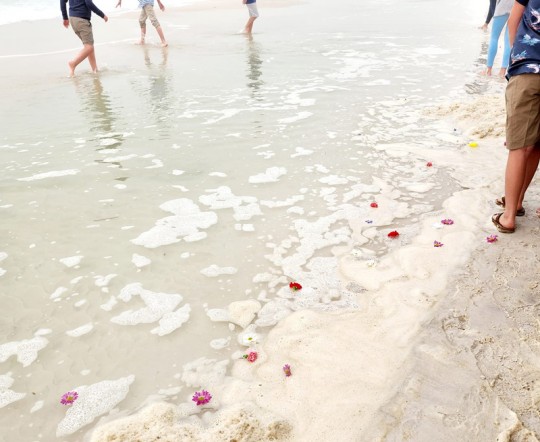 Flowers and flower petals were placed in the water’s edge by those in attendance as a final goodbye.