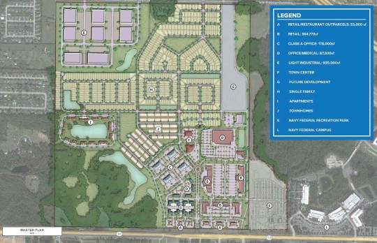 The plan includes a mix of retail, restaurants, office space, townhomes, apartments and light industrial around a town center.