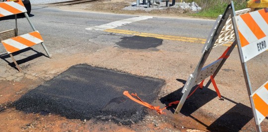 The pothole was in the eastbound lane of West Roberts Road just past the railroad crossing, approaching Highway 29.