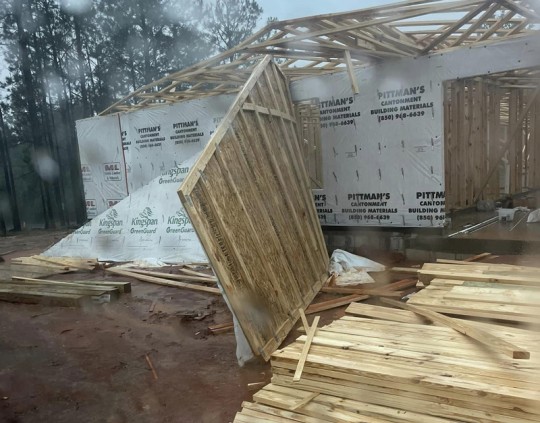 Just off Highway 297A in Cantonment, walls and trusses were blown down at a house under construction (pictured left. Further south on Jackson Street in Myrtle Grove, a home was heavily damaged by a falling tree.