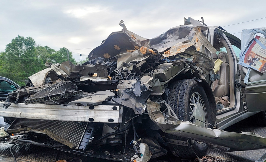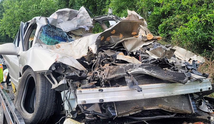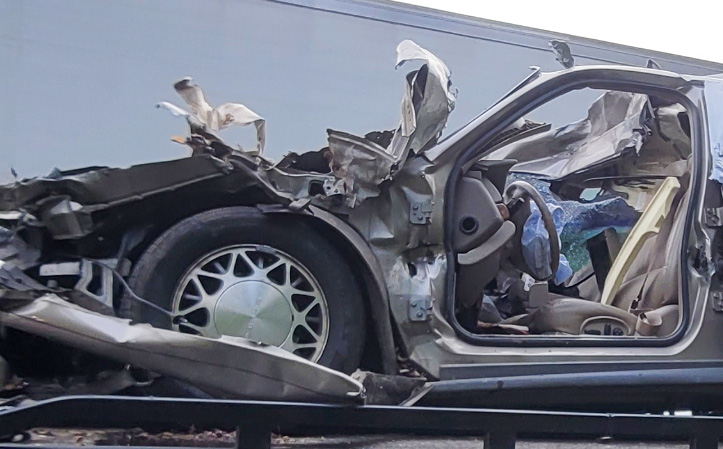 Pictured: A Century woman and her dog were trapped in this vehicle after it ran under a flatbed semi trailer (bottom photo) early Monday morning in Cantonment. NorthEscambia.com photos by Kristi Barber and others, click to enlarge.