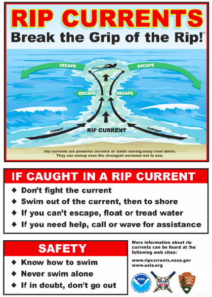 Rip currents are powerful channels of water that are caused by breaks in the sandbar just offshore. Currents flowing away from the coast move fastest where the sandbar is reduced or not present and the water is deeper. Always swim near a lifeguard and ask them where it is safest to swim. If lifeguards are not present, attempt to stay on the sandbars and avoid the area between sandbars where the water color is typically darker. Avoid swimming near piers and jetties where permanent rip currents are present.