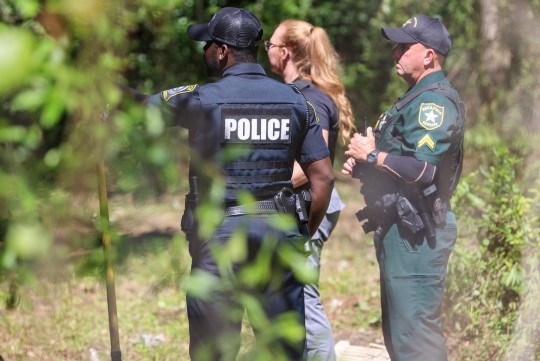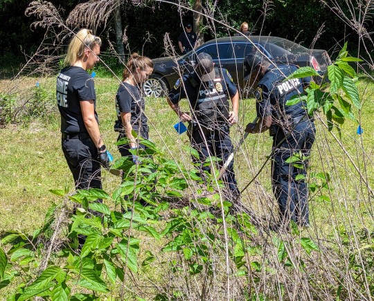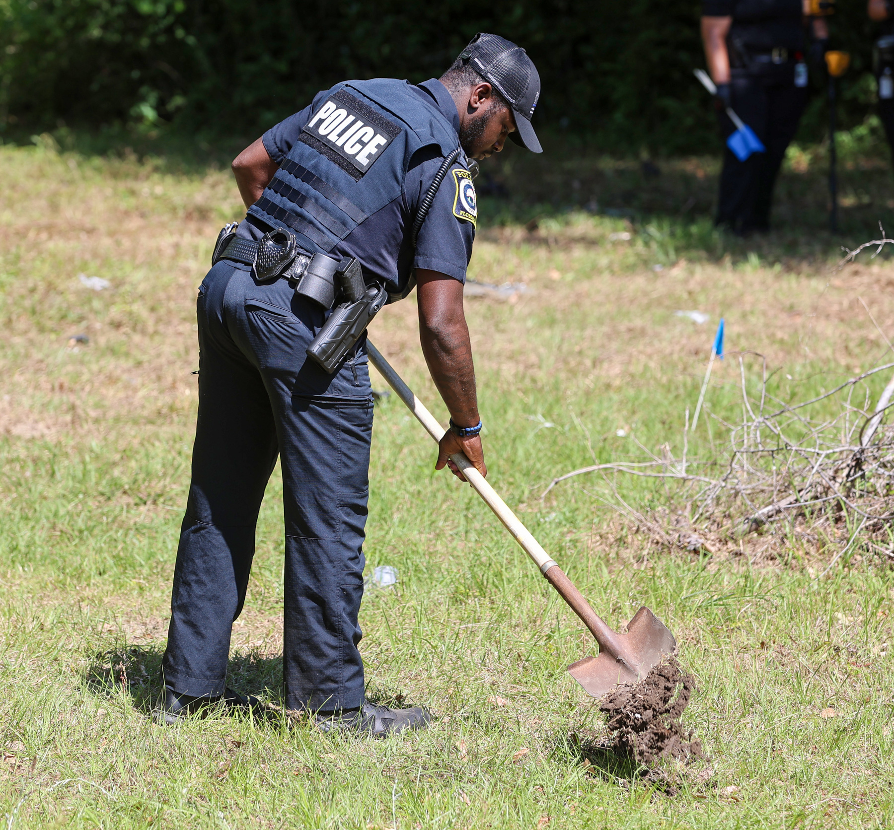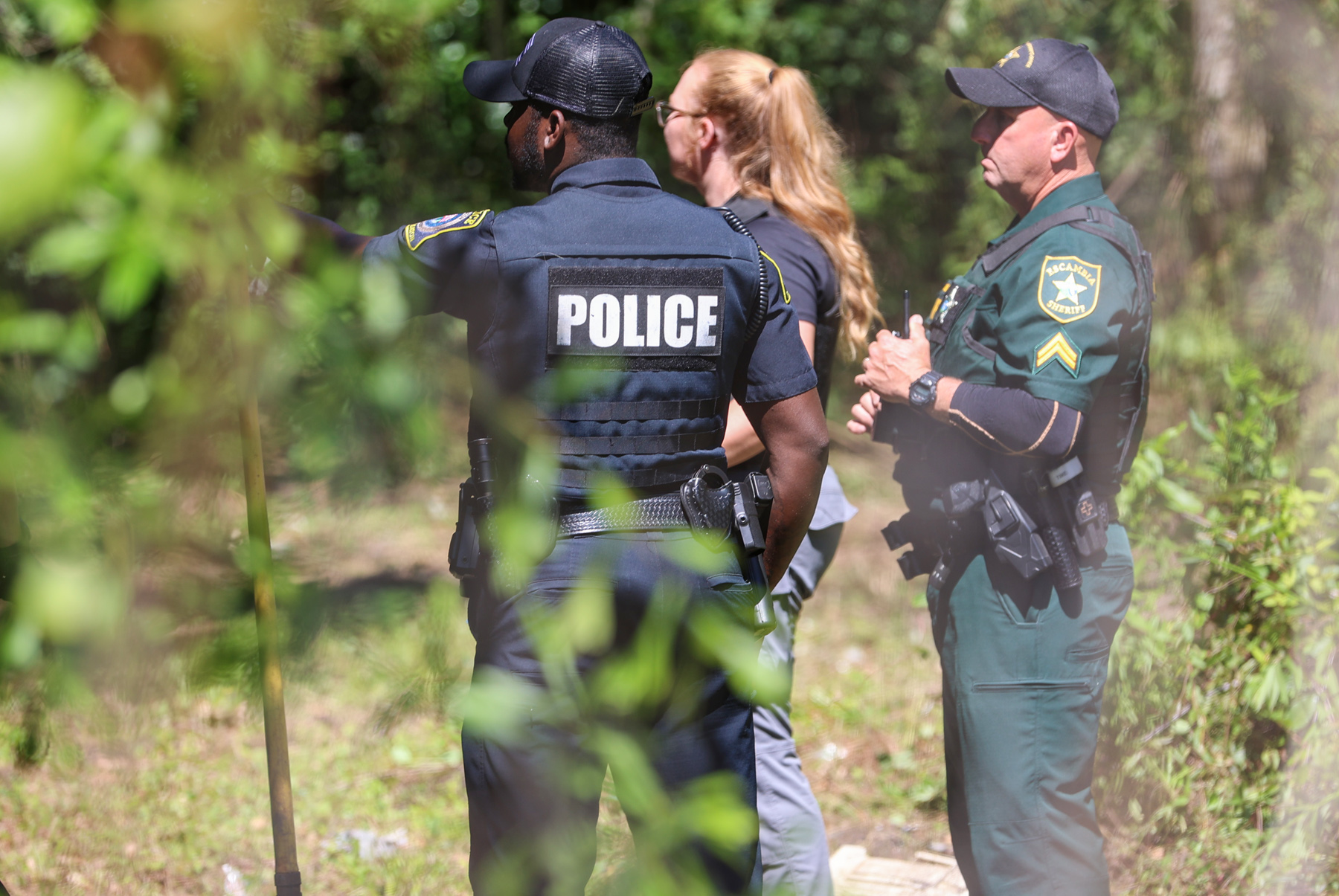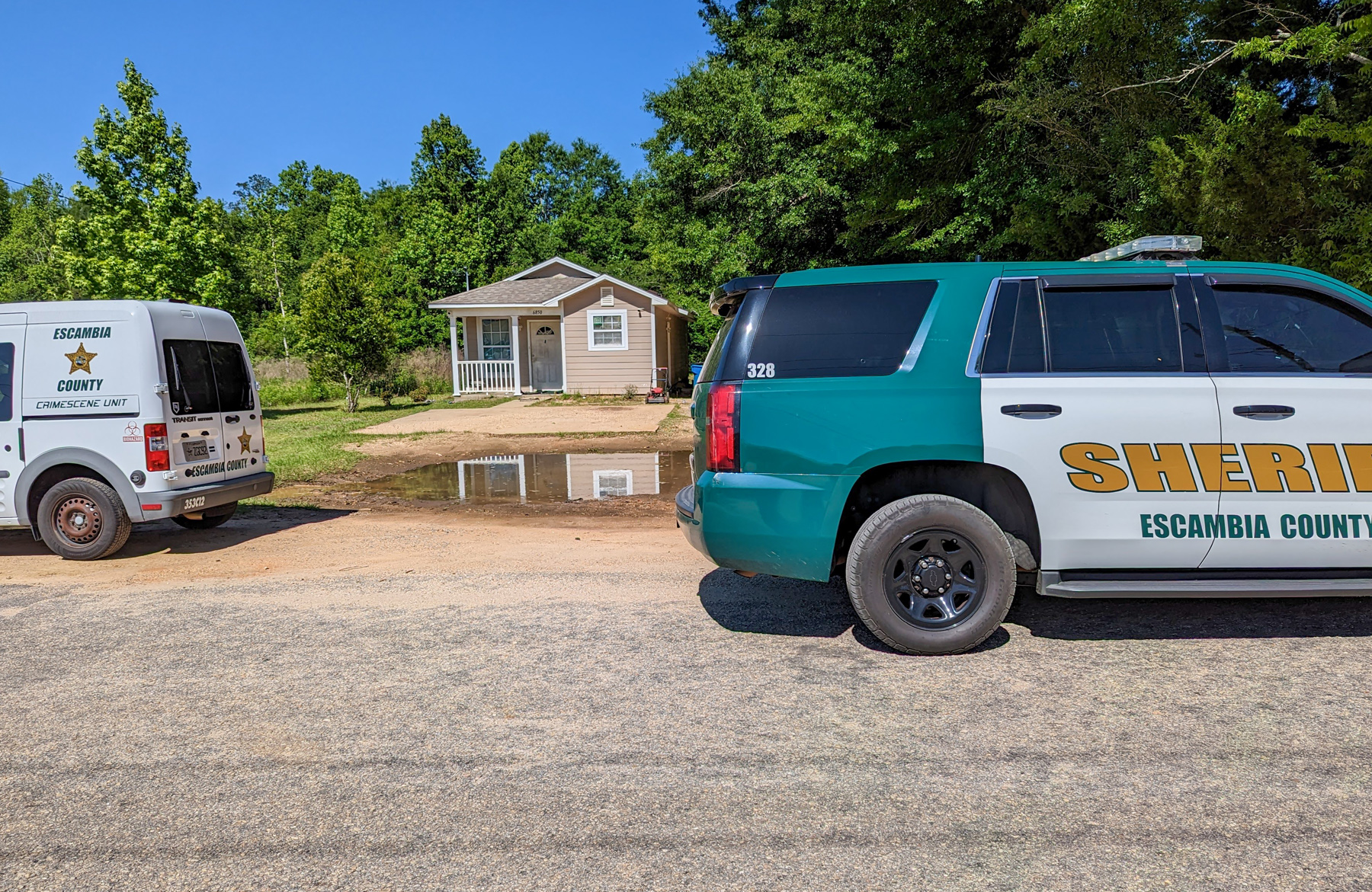 ECSO Florida deputies, investigators and crime scene technicians, along with Flomaton police officers, were seen using metal detectors across the backyard of the home. When the detectors audibly indicated that something metal was found, flags were placed to mark the location. Officers could later be seen digging at the flag marker locations.