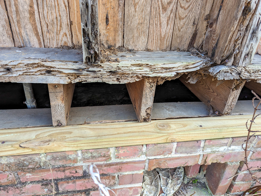 He said the bottom plates of the building — essentially the bottom section of walls where studs are attached — are 70% missing or have termite damage, and there is extensive rot or termite damage to the remainder of the building. Townes said all total, the damage would exceed over 50% of the value of the building. In addition, the structure will not support the capacity required by code.