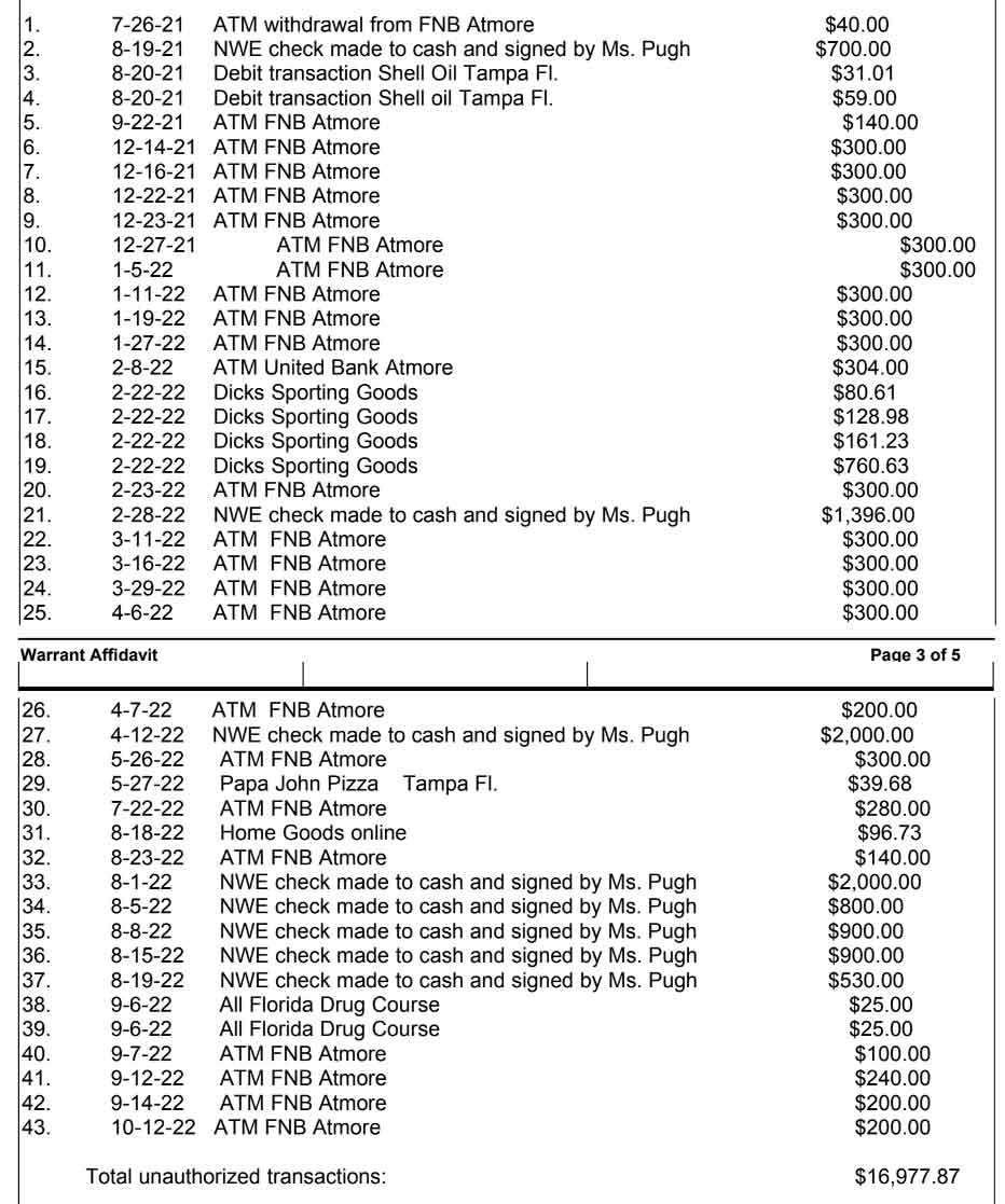 Florida authorities alleged the following transactions were fraudulent, according to court documents. Pugh is not currently charged with making these transactions, and she is not currently charged with any crime.