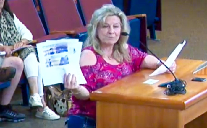 “As recently as last Thursday I found a book within this school district that has graphic pictures of an adult giving pornographic magazines to minor school age boys, complete with open legged naked women on the magazines’ covers,” she said, holding up printed photos. “And yes, this is in your public school libraries.”