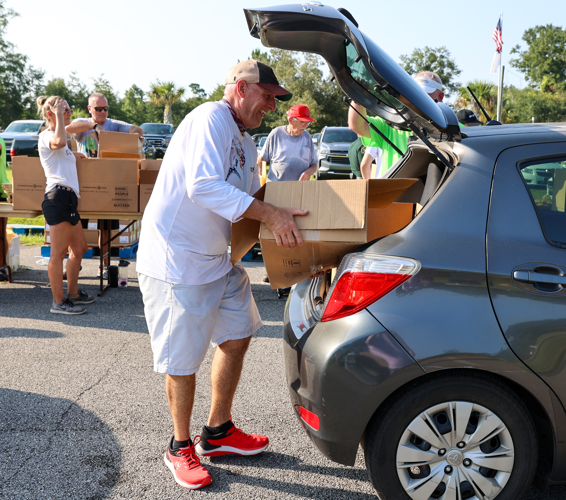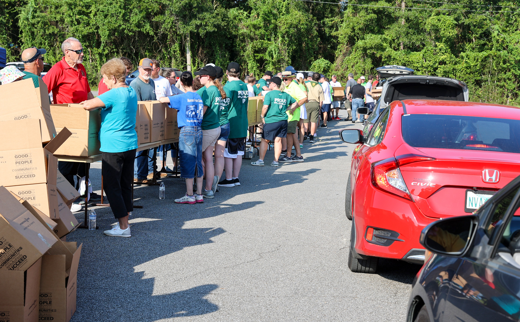 A large group of volunteers distributed 30,000 pounds of food and 350 backpacks filled with supplies and socks in about an hour and a half at the Gonzalez Methodist Church.