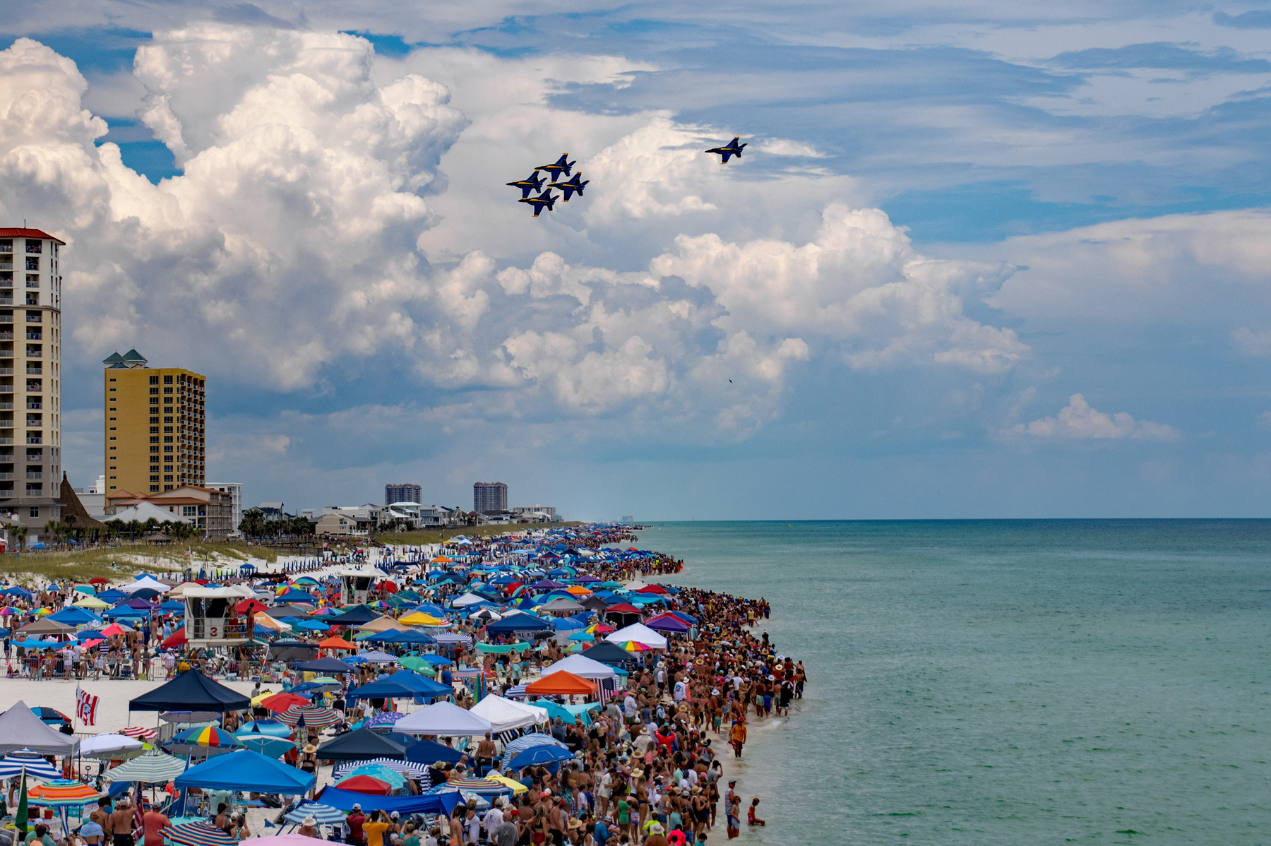 Look to the Gulf horizon at approximately 2 p.m. as the famous C-130J aircraft, affectionately known as Fat Albert, followed by six signature blue and gold F-18 Super Hornets, make their way over Pensacola Beach.