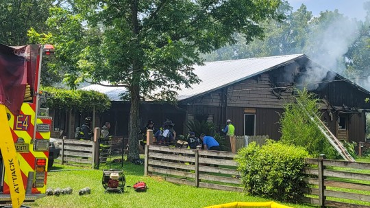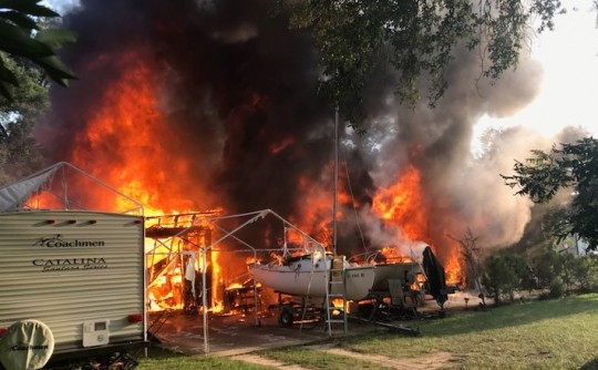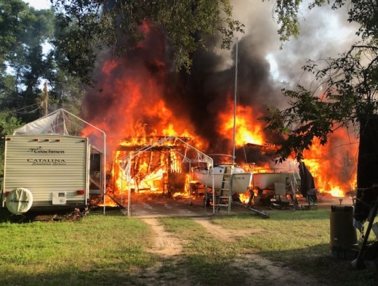 Escambia County Fire Rescue responded to the fire about 6:20 p.m. in the 10000 block of Chemstrand Road. They arrived to find most of the structure engulfed in flames, along with a boat and RV.