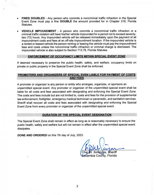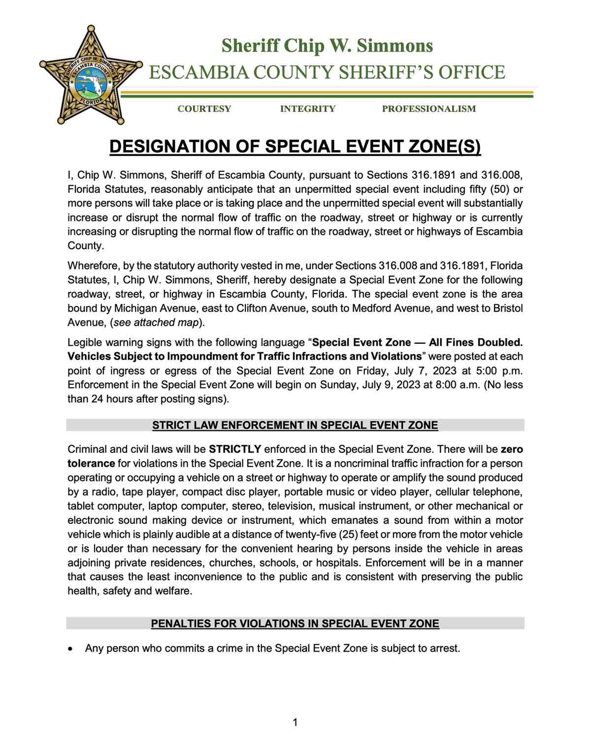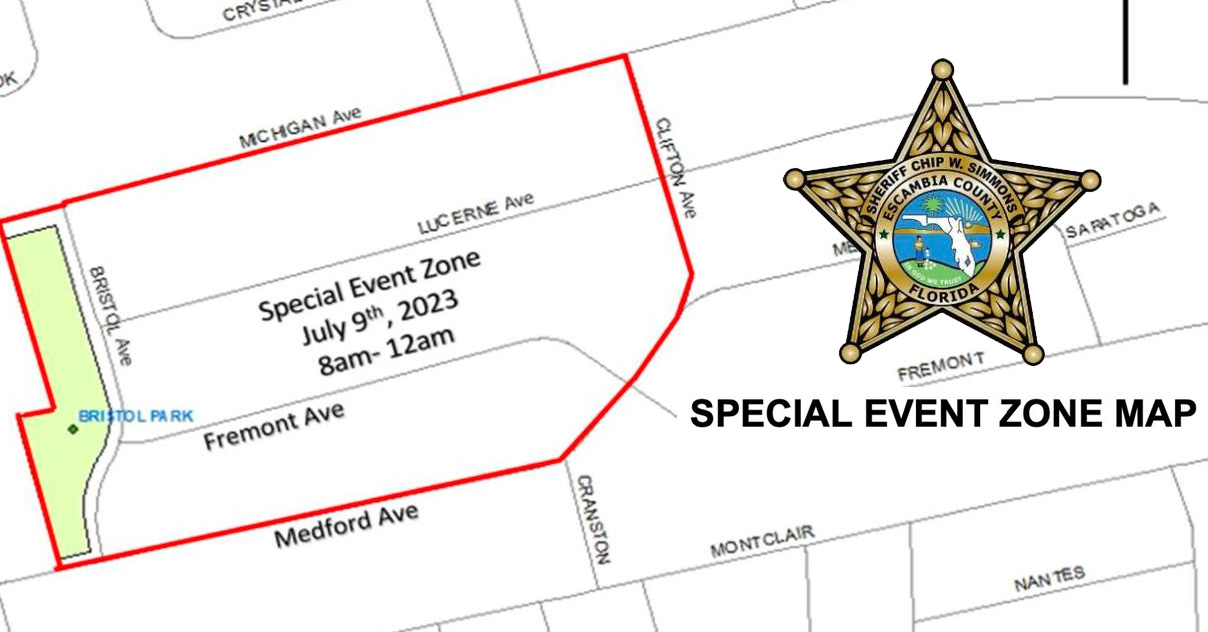 Escambia County Sheriff Chip Simmons has designated the Bristol Park of Escambia County as a “special event zone” ahead of a anticipated unsanctioned event on Sunday.