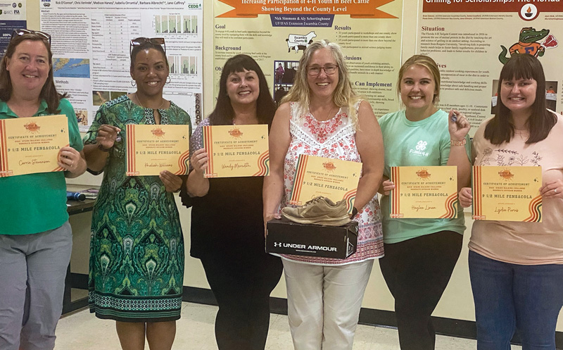Out of 65 teams around the state, Escambia Extension’s “Team 9 1/2 Mile Pensacola” won first place in the “Moderate Division” of University of Florida Health’s Spring Walking Challenge. The team racked up a total of 234,690 steps in the span of four weeks in April. Pictured: Team members (L-R) Carrie Stevenson, Khaliah Williams, Wendy Meredith, Gail Lepley, Lydia Purvis, and Haylee Linam. Not picture are Bridget Stice, Libbie Johnson, and Bethany Diamond. Photo for NorthEscambia.com, click to enlarge.