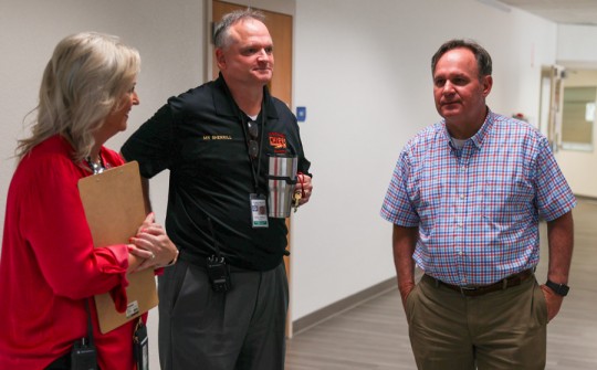 Pictured top: Escambia County interim School Superintendent Keith Leonard (right) speaks with Northview High Principal Michael Sherrill and Dean Somer Bridges Thursday morning. NorthEscambia.com photo, click to enlarge.