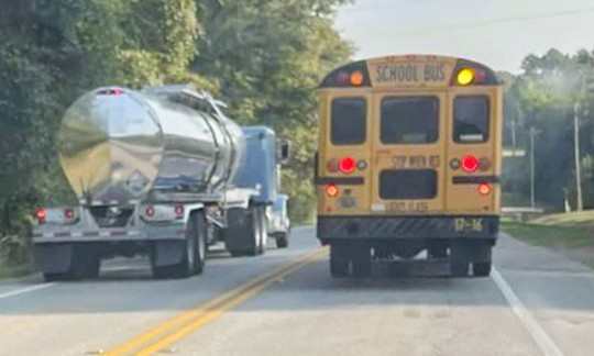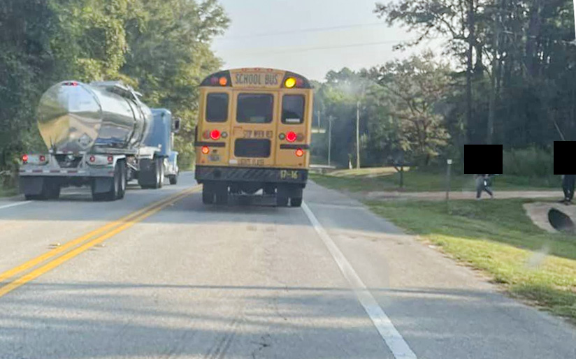 Photos sent to NorthEscambia.com Wednesday morning show a chemical tanker truck passing a school bus stopped to pick up children on Highway 97 in Walnut Hill.