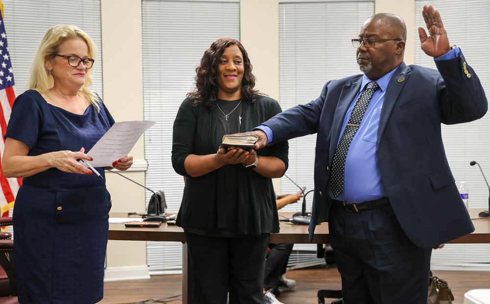 A motion by Alicia Johnson to appoint Gomez passed 3-1, with Shelisa McCall voting no and Gomez abstaining. After a several-minute search for a Bible, Gomez raised his left hand and took the oath of office.