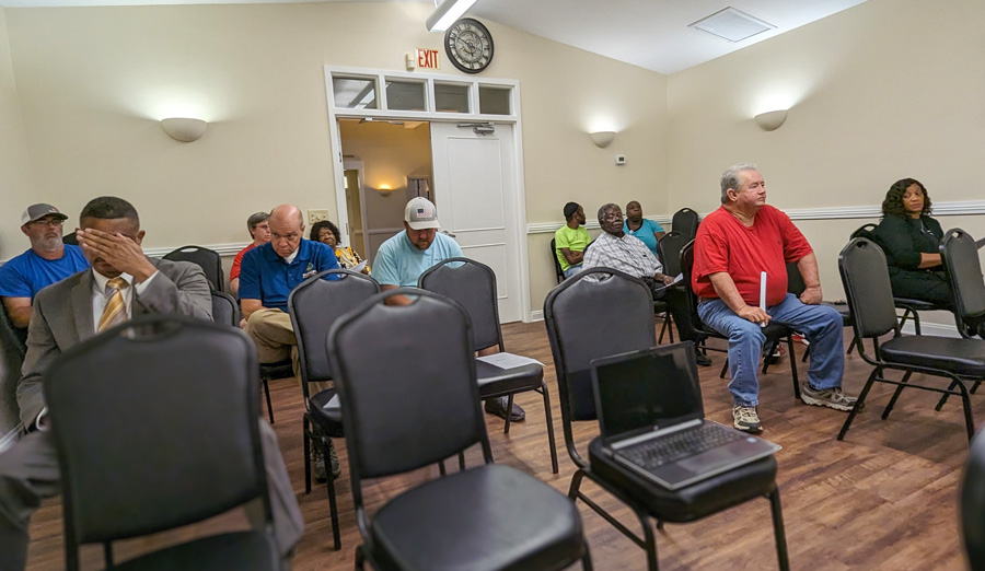 Pictured top: Luis Gomez, Jr. raises his left hand to take the oath of office as interim Century mayor as his wife Denise Gomez holds a Bible Monday night. The oath was given by Town Clerk Leslie Howington. Pictured below: New council president Dynette Lewis. Pictured inset: Council member Shelisa McCall voted against Gomez’s appointment as interim mayor. Pictured below: About a dozen people, mostly town residents and employees, attended the Monday meeting. NorthEscambia.com photos, click to enlarge.