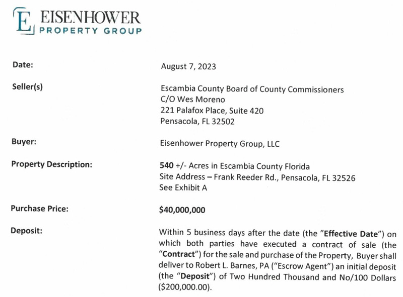 The Eisenhower Property Group submitted the $40 million offer for 540 acres of OLF on Nine Mile Road. The county was originally selling 540 acres, but the county commission has indicated the desire to hold back about 250 acres for job creation.