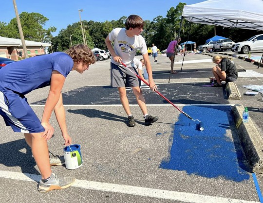 Many will finish their painting job on Monday. The parking space painting event was a fundraiser for the senior class.