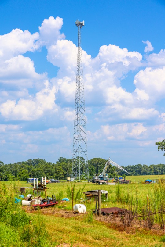 Pictured: A new 280-foot Verizon tower on Wilma Road near Walnut Hill. A worker can be seen on the tower in the top photo (below the equipment, with two buckets). NorthEscambia.com photos, click to enlarge.