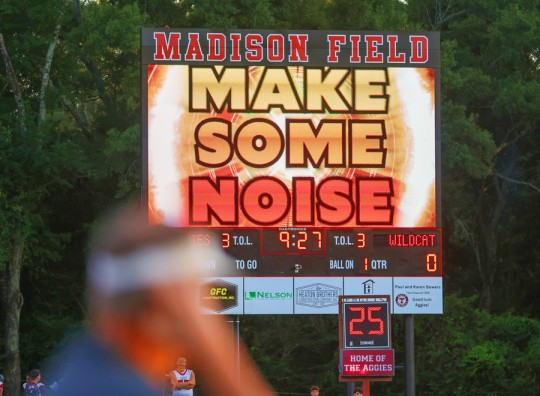 The board is used for live play-by-play video, player spotlights and interviews, hype videos and advertisements. At the top of the board is a sign that proclaims “Madison Field”.