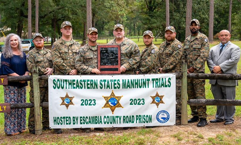 The Century Correctional Institution K-9 team placed second in the Multiple Leash Division at the Southeastern State Manhunt Field Trials hosted by the Escambia County Road Prison. Pictured from Century CI are (L-R) Lieutenant J. Booth, Sergeant C. King, Officers D. Patterson and J. deGraaf, Sergeants J. Sanders and D. Walker, Officer M. Wilson, and Warden K. Watkins. Photo for NorthEscambia.com, click to enlarge.