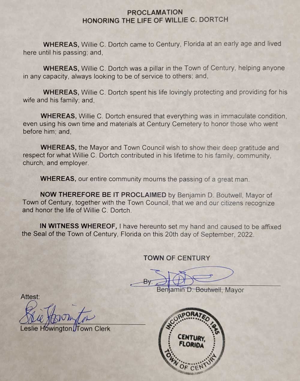 On behalf of the Dortch Family, I’d like to thank the Town of Century for acknowledging my dad Mr. Willie C. Dortch. Thank you all for your kind words and gesture.