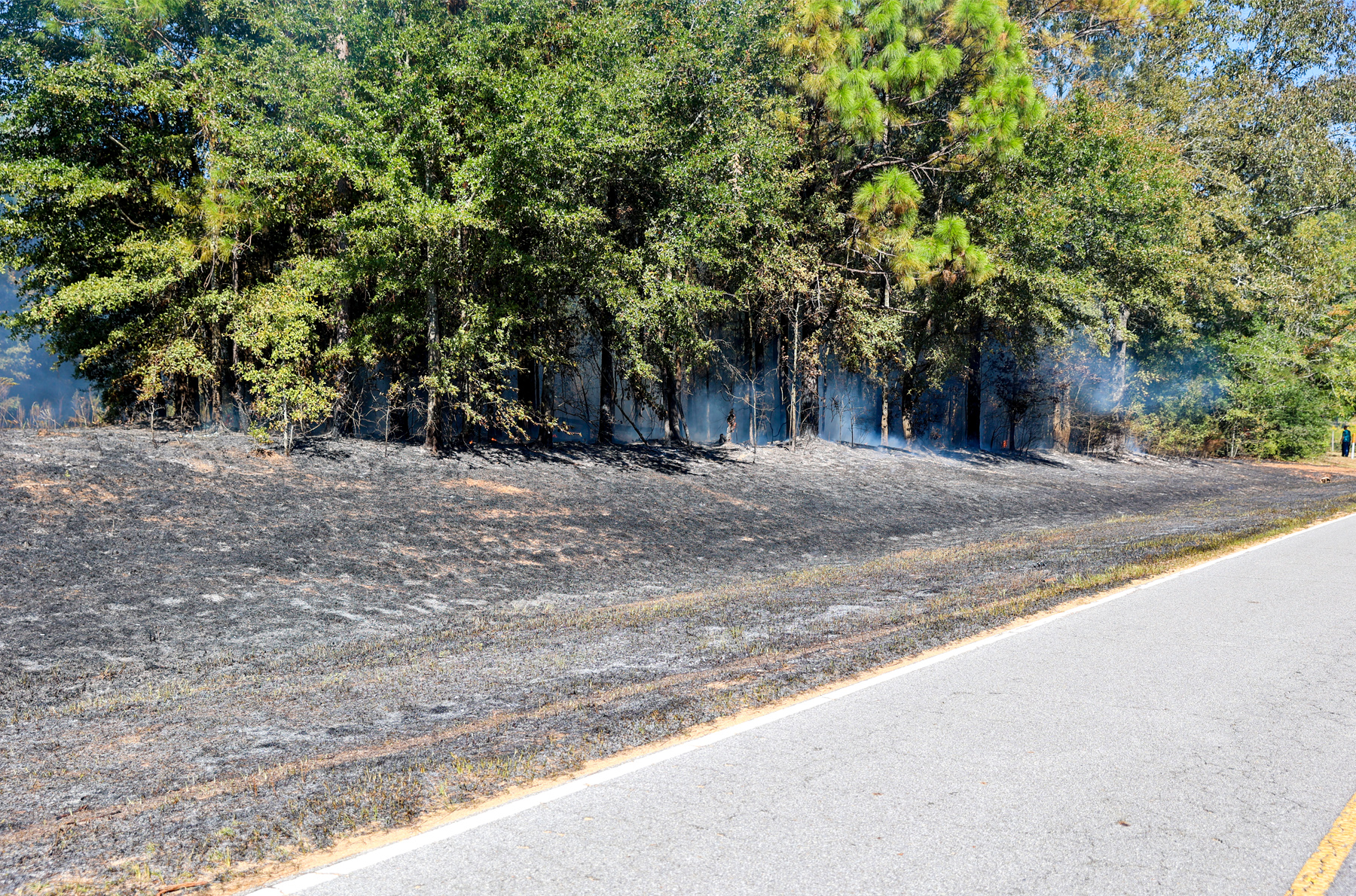 The fire was reported just after 2 p.m. in the 3000 block of West Highway — between C.W. Caraway Road and the closed bridge over Canoe Creek. The fire consumed about four acres as firefighters worked for over an hour to contain it.