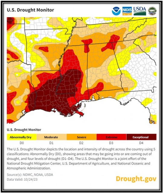 The central Gulf coast continues to be in the grips of high intensity drought. The local area sees severe to extreme drought conditions with points to our west, over southwest MS and much of the state of LA, seeing exceptional drought. The latest drought information information is in the graphic above.