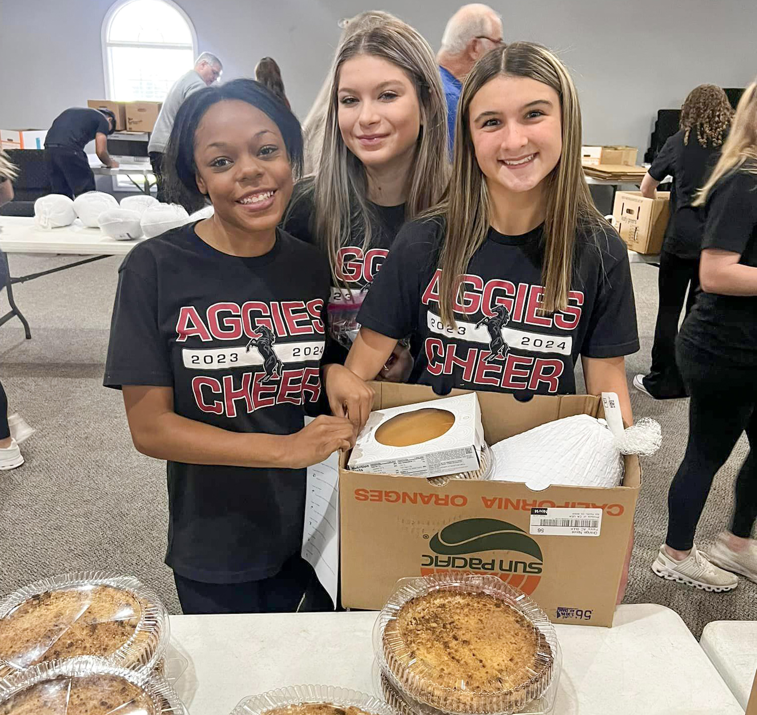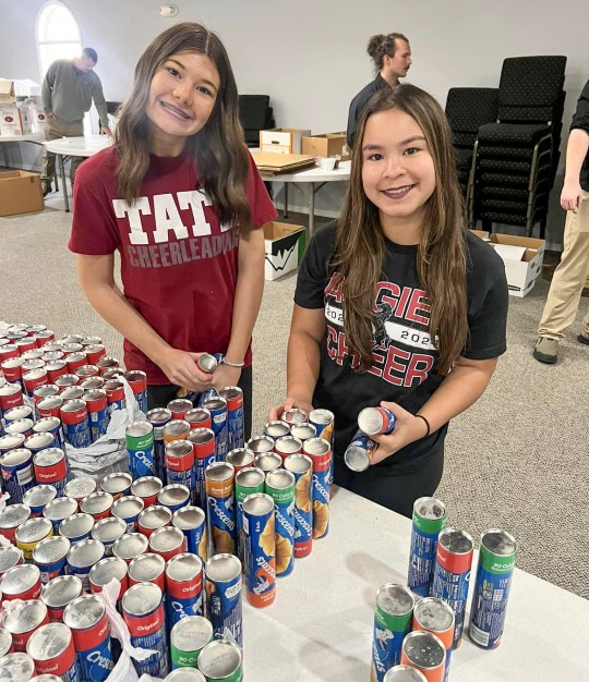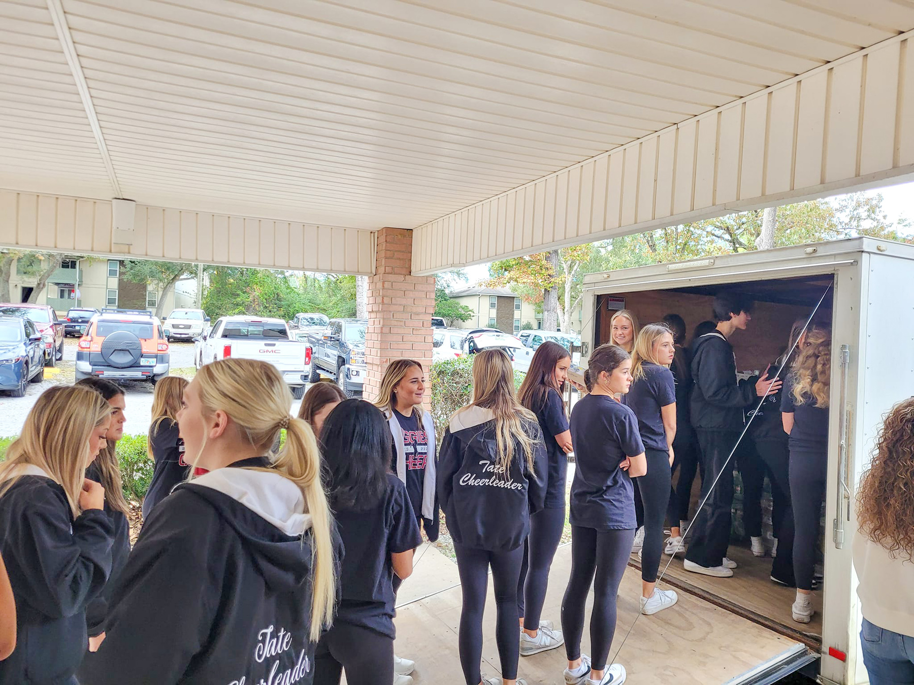 The Tate High School cheerleaders volunteered Wednesday at St. Luke United Methodist Church to help package the meals for delivery.